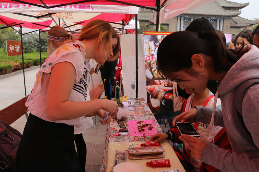 弘扬中华优秀传统文化的中国摊位更赚足了人们的眼球。从京剧脸谱到笔墨纸砚,吸引了众多学子前来体验,这同时也不失为一次外国留学生们深入了解中国的契机。正是缘于开封古朴而又悠久的历史文化,荷兰的留学生Alexander选择了河南大学,在黄河文明研究中心潜心研修。“我喜欢这里的每一个建筑,它们无不透露出这所学校所具有的厚重的灵魂”,Alexander的中文水平毫不逊色,活动刚刚开始,他就与路过学生愉快地交谈了起来。