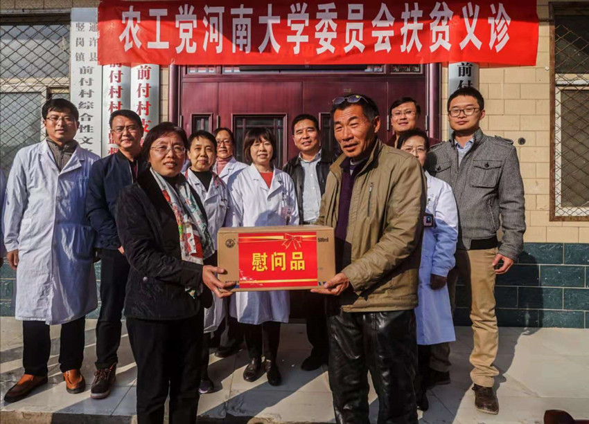 11月9日,农工党河南大学委员会主任委员万琪琳带领医疗卫生专家组,在我校数学与统计学院党委书记史富强、校党委统战部副部长于红英的陪同下,前往河南大学扶贫点——通许县竖岗镇前付村义诊,为村民上门服务诊病送药,并赠送了价值3000多元的药品。