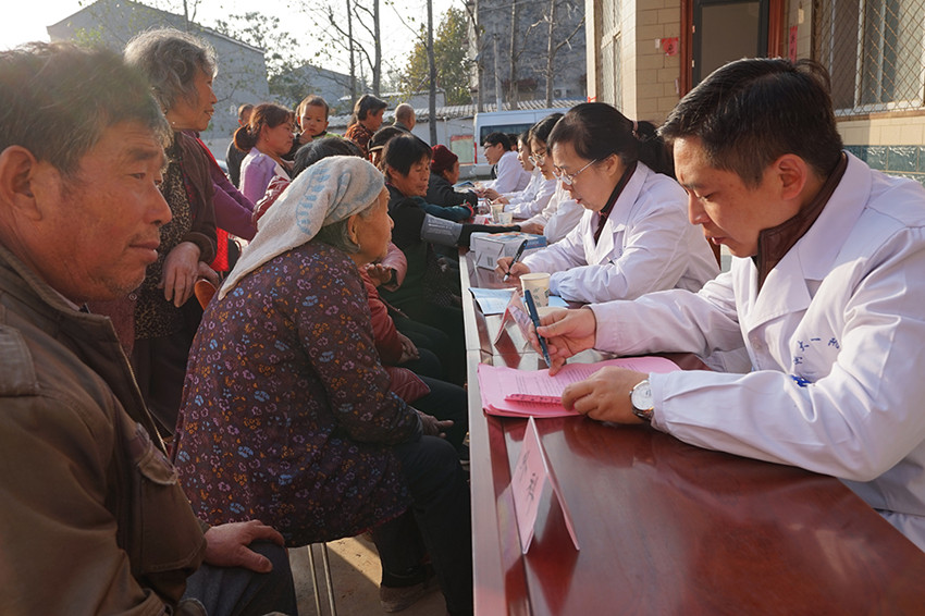 此次义诊活动由河南大学党委统战部牵头组织,农工党河南大学委员会主任委员万琪琳,淮河医院副院长、消化内科主任医师索智敏,中医科主任医师张艳丽,合作发展部副主任、骨科副主任医师张鹏;第一附属医院甲状腺乳腺外科副主任医师赵爱国、麻醉科主治医师陈英、妇产科主治医师宋娟、感染科主治医师冯磊8位医疗专家参加,包括内科、外科、骨科、中医科、心脑血管科、全科6个科室,基本满足了农村常见病的诊疗需求。到达扶贫点后,医疗队兵分两路迅速展开诊治活动,一个小组由万琪琳和索智敏两位专家组成,在村干部和我校驻村第一书记梁刚的陪同下,先后到患病老党员李书轩、何清素、夏金民家中,为老党员把脉问诊,分析病情,研判治疗方案,赠送药品。老党员何清素是一名1958年入党的女同志,身患高血压、冠心病等多种老年疾病,看到专家亲自送医上门,老人拉住专家的手嘴里不住地念叨“谢谢……谢谢……”;另一个医疗小组也在村委大院摆桌挂牌,为等候在那里的村民展开了检查诊治。就医村民按患病情况对科就诊,义诊活动紧张有序,3个多小时诊治病人120余例。