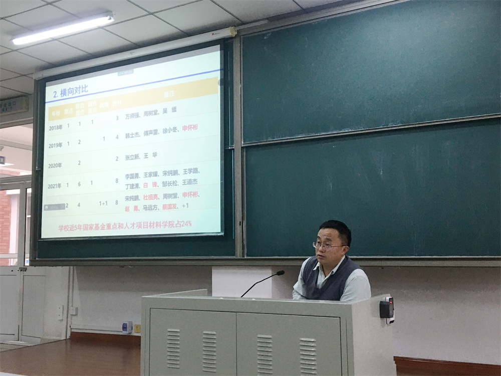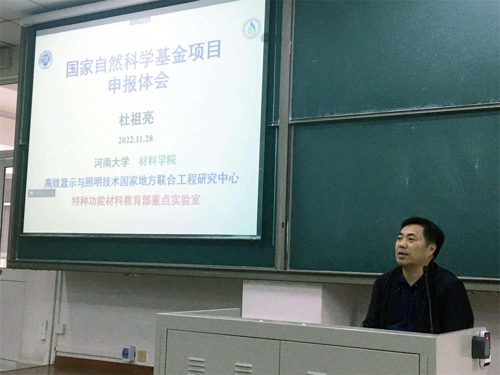 院长杜祖亮教授作题为《国家自然科学基金项目申报体会》的报告,他从目前国家和学校科研评价体系谈起,阐明了国家自然科学基金在催生原始创新和助推青年人才成长方面的重要意义。他结合自身多年的科研工作经验和国家自然科学基金项目申报经历,从基金选题到申请书撰写,对国家自然科学基金申请工作进行了全面剖析。他以去年申报获批的国家自然科学基金重点项目“高性能大面积量子点发光二极管关键材料与器件”为例,详细介绍了基金申请书中题目、摘要、立项依据和拟解决的关键科学问题等部分的写作方法和注意事项,并就如何高质量撰写基金申请书给出建议。他表示,学院教师要集中精力做好2023年度国家自然科学基金项目的申报工作,学院将组织特聘教授和校外专家,对项目选题、关键科学问题凝练以及申请书撰写等进行“一对一”“手把手”的全方位指导,做好“传帮带”,提高项目申报质量,力争实现2023年度基金申报工作的“量”“质”齐升。