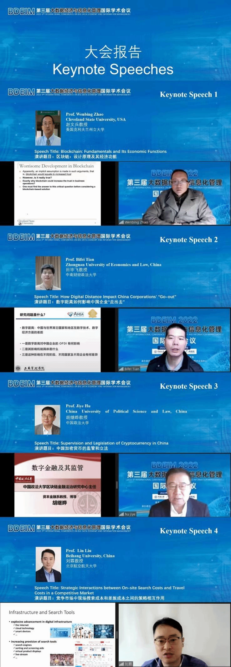 来自克利夫兰州立大学赵文兵教授、中南财行政法大学田毕飞教授、中国政法大学胡继晔教授、北京航空航天大学刘霖教授分别以“区块链:基本面及其经济功能”“数字距离如何影响公国企业的退出”“中国加密货币的监督和立法”“在竞争激烈的市场中,现场搜索成本和旅行成本的战略互动”为主题作学术报告。来自悉尼大学、四川大学、浙江大学、北京交通大学等全球高校的30位专家围绕着大数据挖掘、人工智能与互联网经济、区块链与云计算、信息管理系统、计算机科学与互联网、电子商务与电子政务等分别作主题报告并展开研讨。