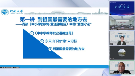 为进一步健全教师专业化成长机制,搭建好教师人才培育高端平台,推动高等教育、基础教育与教师教育的协同创新、融合发展,12月1日,由河南省教育厅主办,河南大学和河南省教育家书院承办的“师德课堂”系列活动开幕。河南省教育厅总督学刘林亚,河南省教育家书院院长刘志军出席本次活动并致辞,河南省教育厅教师教育处处长李松原主持。全省中小学及幼儿园在职教师、“优师计划”等公费师范生及各高等学校师范类专业在校生等超过31万人在线参加。