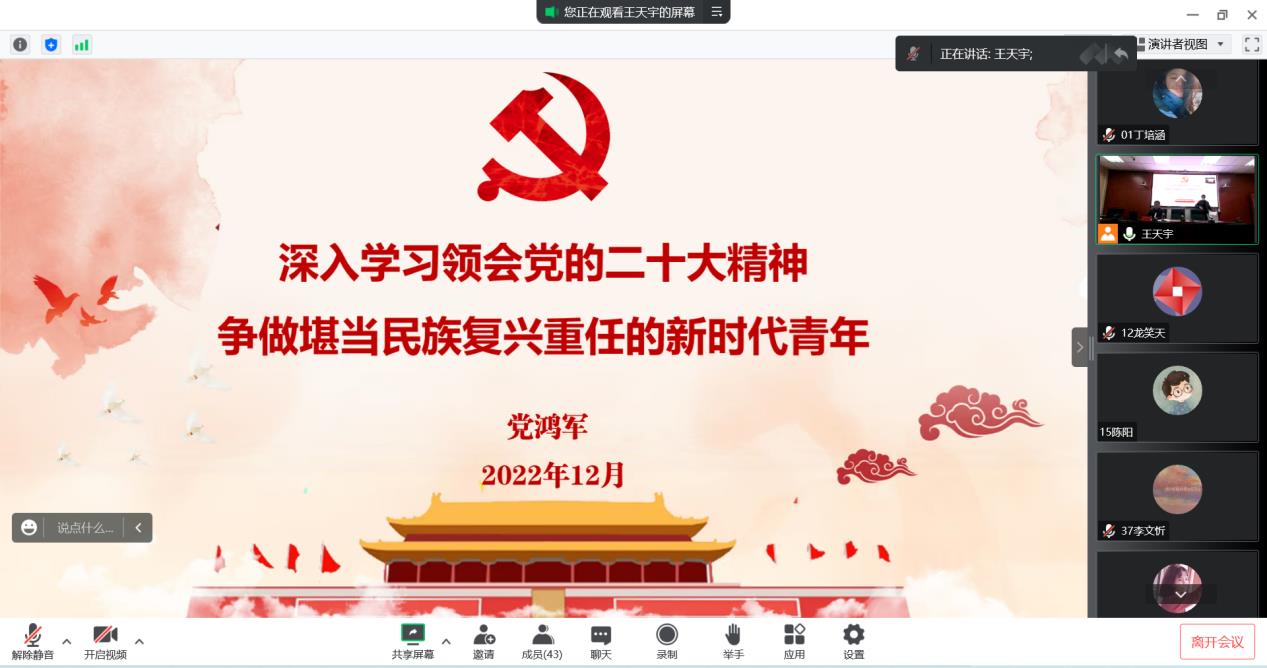 12月12日,哲学与公共管理学院通过线上线下结合的形式举行青年马克思主义者培养工程第五期培训班开班仪式。学院党委书记党鸿军以《深入学习领会党的二十大精神,争做堪当民族复兴重任的新时代青年》为题向全体学员作开班第一讲。