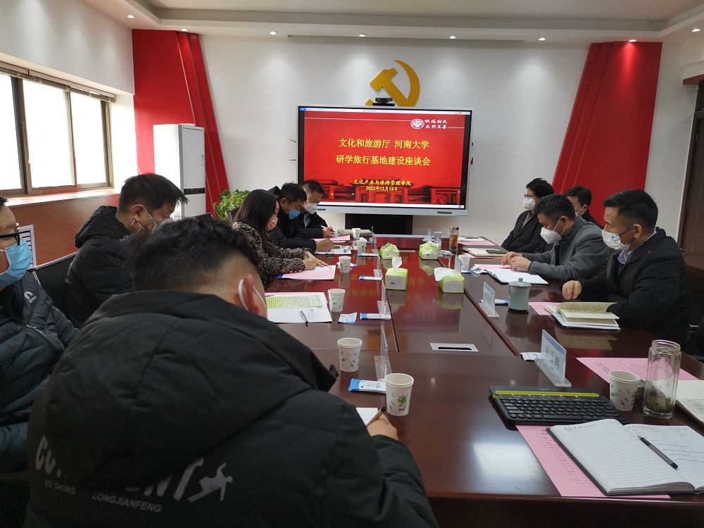12月13日上午,河南省文化和旅游厅老干部处副处长肖蕊萍、艺术处副处长杨天舵一行到文化产业与旅游管理学院,就筹建旅游研学实践基地展开座谈。校国内合作办公室主任刘志勇,文化产业与旅游管理学院党委书记孔涛,文化产业与旅游管理学院院长程遂营,马克思主义学院党委副书记吴涛,文化产业与旅游管理学院副院长徐飞、张召鹏,研学旅行研究中心主任陈楠等参加座谈。座谈会由校国内合作办公室副主任刘会宾主持。