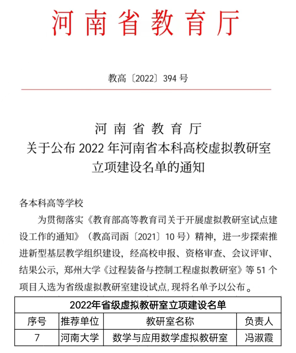 近日,省教育厅公布了新一批河南省本科高校虚拟教研室立项建设名单(教高【2022】394号),数学与统计学院申报的“数学与应用数学专业虚拟教研室”成功入选。