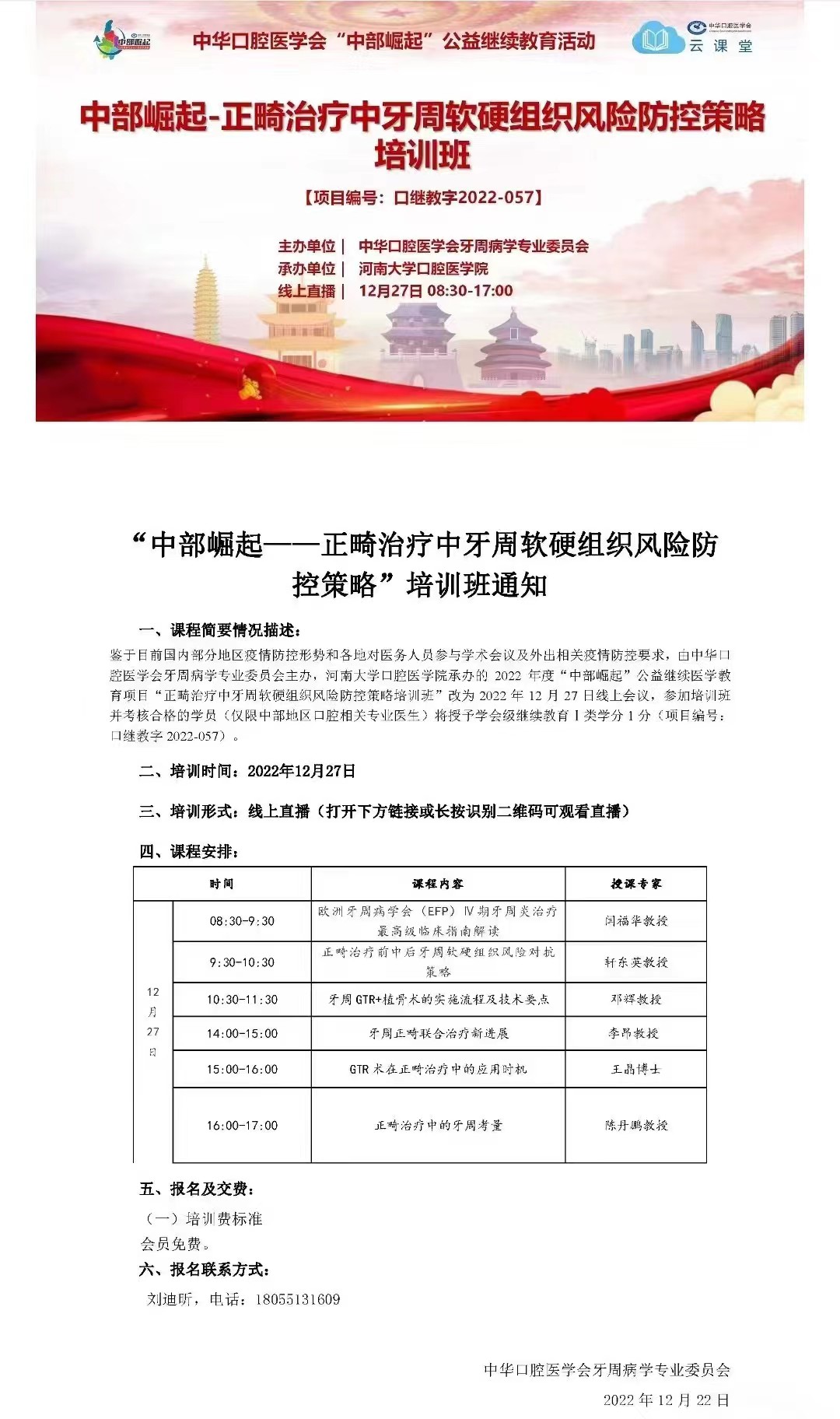 12月27日,河南大学口腔医学院作为中华口腔医学会“中部崛起”公益活动继续教育基地,采用线上会议方式承办了2022年度“中部崛起”公益继续医学教育项目“正畸治疗中牙周软硬组织风险防控策略培训班”,培训班由杭州市口腔医院轩东英教授主持。