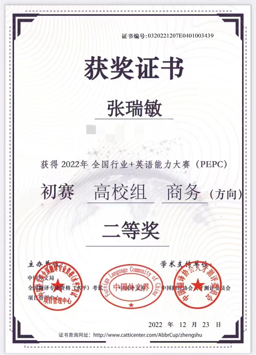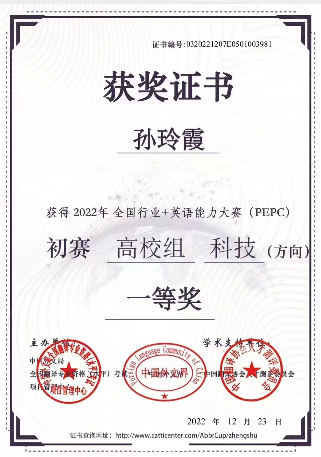 近日,2022年全国行业+英语能力大赛(PEPC)初赛通过线上方式举行。外语学院2022级英语口译专业研究生孙玲霞和张瑞敏在指导老师付江涛的带领下,参加了本次比赛,并分别取得了一等奖和二等奖的好成绩,成功晋级了全国总决赛。