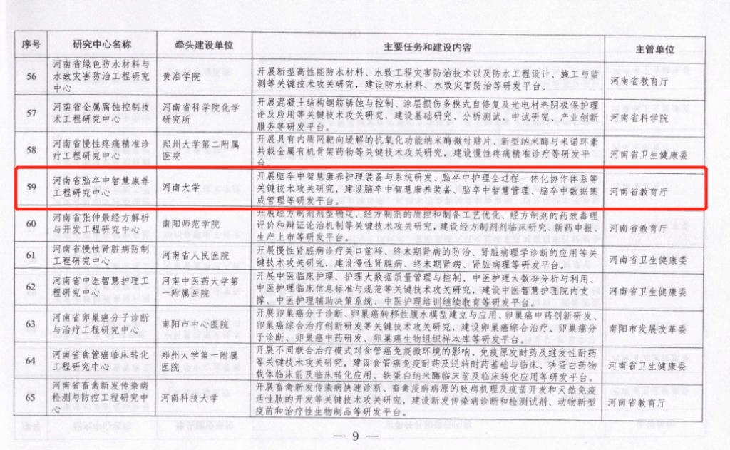 近日,河南省教育厅公布了新一批河南省本科高校虚拟教研室立项建设名单(教高〔2022〕394号),护理与健康学院牵头申报的“中西部综合性大学康养护理虚拟教研室”成功入选;河南省发改委即日也批复了85个省级工程研究中心,学院牵头申请的“河南省脑卒中智慧康养工程研究中心”正式获批。