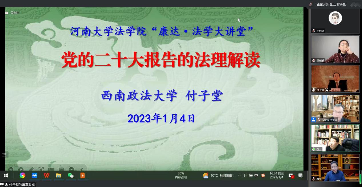 1月4日下午,法学院“康达·法学名家大讲堂”2023年第一场开讲。西南政法大学校长付子堂教授受邀为师生作题为“党的二十大报告的法理解读”学术讲座。讲座由法学院院长蔡军教授主持,法学院名誉院长郝铁川教授、副院长岳红强副教授担任与谈人。学院全体班子成员及部分师生300余人在线聆听了讲座。
