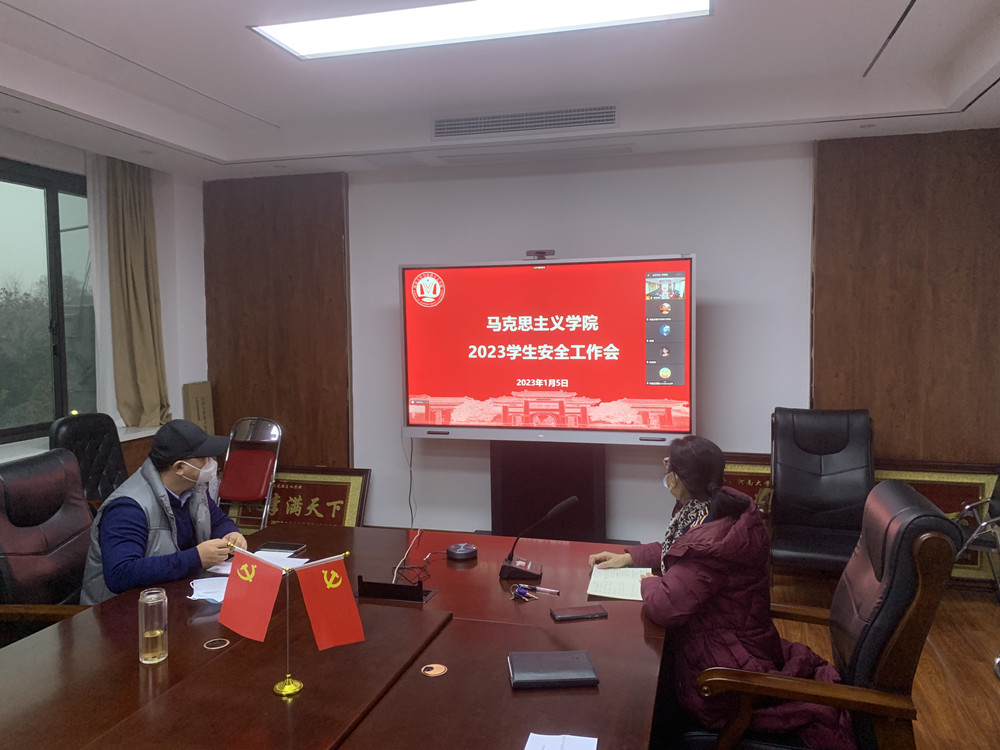 为全力做好学生安全工作, 1月5日,马克思主义学院在明伦校区科技馆三楼会议室召开学生安全工作专题会议。学院党委书记彭绪琴、2019级辅导员常恒博、2019级全体本科生参加会议。会议由副院长张枫林主持。