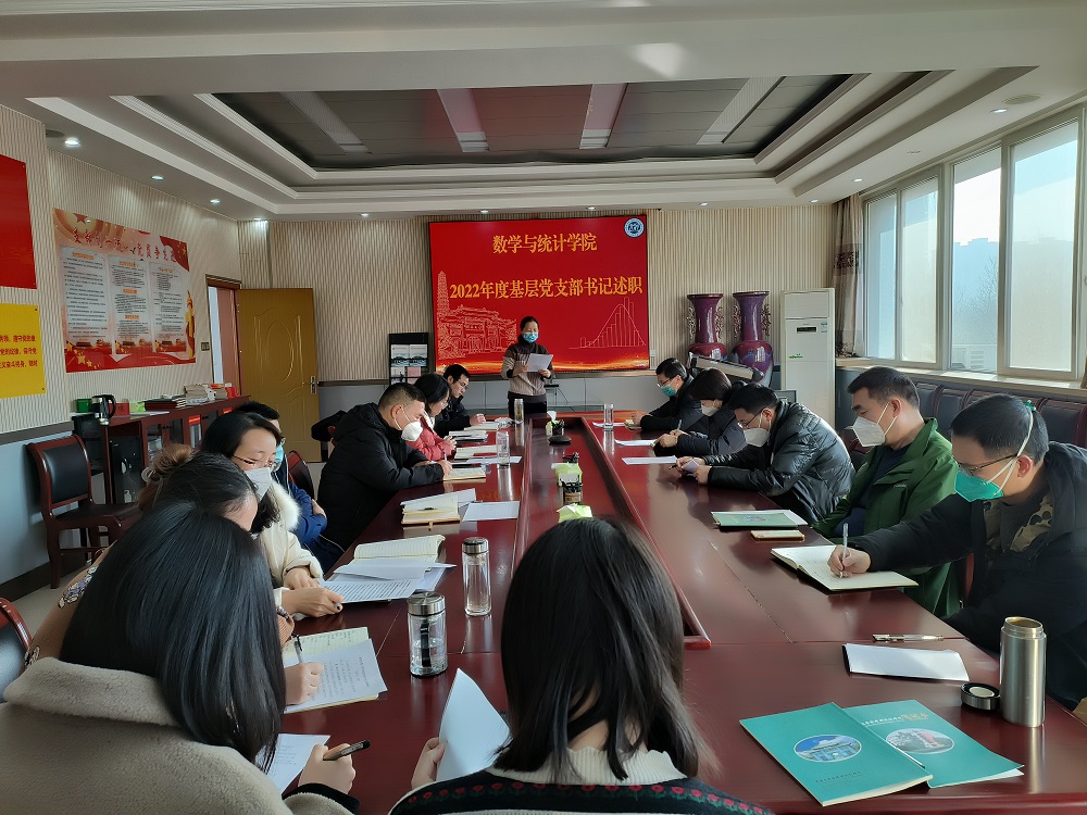 为深入学习贯彻习近平新时代中国特色社会主义思想和党的二十大精神,进一步推动全面从严治党向基层延伸,压紧压实支部书记抓党建的政治责任,不断提高基层党建工作质量,提升党建引领力。1月9日上午,数学与统计学院在学院二楼党建活动室召开2022年度基层党支部书记党建工作述职评议考核会。学院党委委员、领导班子成员和各党支部书记参加会议。会议由院党委副书记赵红磊主持。