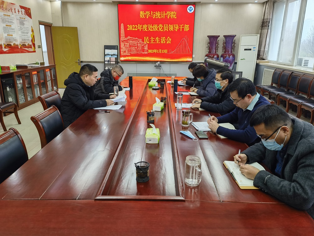 1月13日下午,按照学校党委工作安排和要求,数学与统计学院党委在学院二楼会议室召开2022年度处级党员领导干部专题民主生活会,学院全体党员领导班子成员参会,副院长唐恒才列席会议,并做自我检视剖析。会议由院党委书记史富强主持。