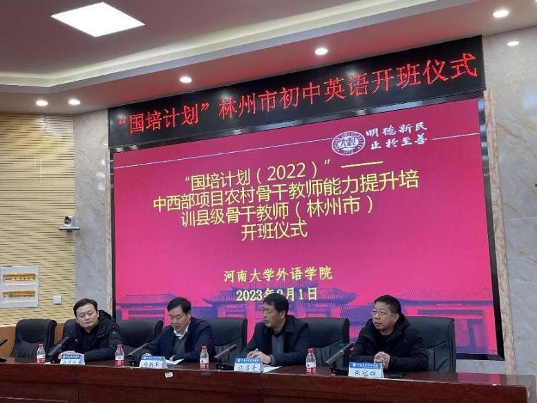 2月1日上午,“国培计划(2022)”中西部项目农村骨干教师能力提升—初中英语县级骨干教师(林州市)在河南大学外语学院北楼三厅召开。外语学院院长杨朝军、林州市教师进修学校校长江秀青一行三人出席了开班仪式,仪式由副院长赵涛涛主持。