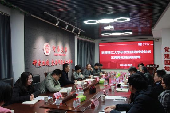 2月6日下午,浙江大学研究生院培养处处长王青青教授受邀到我校研究生院座谈交流。校研究生院常务副院长苗琛教授、医学院副院长王新春教授、基础医学院院长李继承教授,河南大学研究生院、淮河医院、第一附属医院相关领导和职能部门负责人参加座谈。