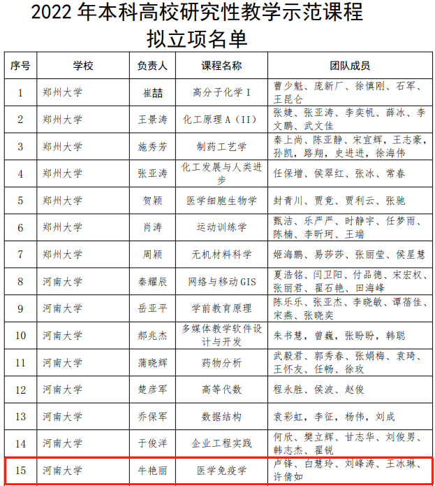 近日,根据《河南省教育厅关于公布河南省本科高校研究性教学系列项目名单的通知》(教高〔2023〕36号),河南大学共获批研究性教改项目6项、研究性教学示范课程8项,其中基础医学院教师主持的教改项目1项、示范课程1门。