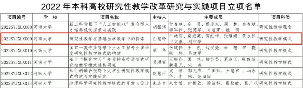 该项目是河南省教育厅为进一步深化高等教育教学改革,积极推进研究性教学工作,提高教学质量,加快高素质创新型人才培养而设置的研究性教学系列项目。学院教师白慧玲教授主持的“研究性教学在基础医学教学研究中的探索”获批研究性教改项目,牛艳丽老师主持的《医学免疫学》获批研究性教学示范课程。