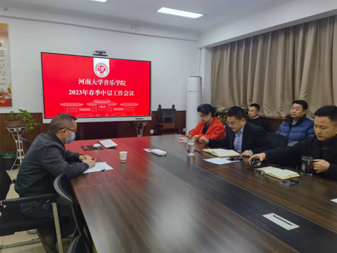 2月16日下午,音乐学院在党建活动室召开2023年春季学期中层工作会议。学院领导班子成员,两办主任,教务、科研、团委、研究生管理等办公室负责人,各系主任,教师党支部书记参加会议。学生党支部书记,各系副主任列席。会议由院党委书记王志国主持。