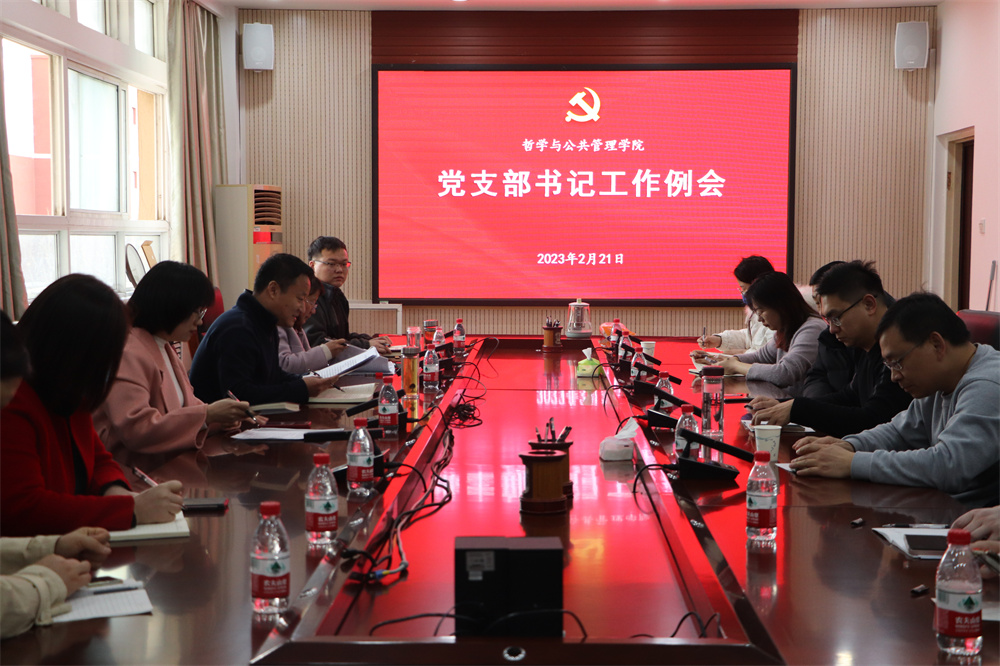 2月21日上午,哲学与公共管理学院在院第二会议室召开党支部书记工作例会,院党委书记党鸿军、党委副书记骆春丽及全体党支部书记参加会议。会上,骆春丽安排部署了2022年度基层党组织组织生活会和民主评议党员工作。院党委办公室主任贾银兰就党员发展、党费交纳、党日活动和“学习强国”常态化学习等工作进行提醒。与会人员就2023年度“三会一课”、主题党日活动计划等进行讨论交流。党鸿军就学习宣传贯彻党的二十大精神系列活动进行安排,并提出三点要求。一是在理论学习和理论研究上下功夫,充分发挥学院哲学社会科学专业优势,将对党的二十大精神的研究阐释工作嵌入科研系统工程;二是创新学习方法,富有成效地开展特色党日活动,支部书记要上好党课,以身促学,营造出积极奋发、共同进步的学习氛围;三是大力推进党的二十大精神进课堂、进教材、进头脑,树立标杆、打造品牌、做出实效,切实把党的二十大精神落实到教学科研管理等各个方面,推动党建工作与事业发展深度融合。