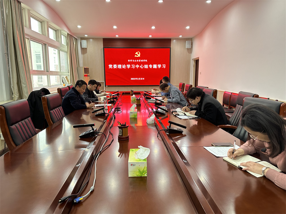 2月22日上午,哲学与公共管理学院党委理论学习中心组在院第二会议室学习习近平总书记关于中国式现代化的重要论述,院党委书记党鸿军,院党委副书记、院长姬志闯等全体班子成员参加学习。会上,党鸿军领学了习近平总书记在学习贯彻党的二十大精神研讨班开班式上的重要讲话精神,与会成员围绕“中国式现代化”开展专题学习研讨。姬志闯表示:“中国式现代化理论,是党的二十大的一个重大理论创新,不仅作为科学社会主义的最新成果凝聚了党领导全国各民族人民长期探索的实践经验,也为中国和世界的发展提供了中国道路和中国智慧,并因为民族复兴和人类文明新形态建构的旨归而共同构成了当代中国的三大叙事。我们不仅要在理论上理解其逻辑、特征和要求,还要在实践中长期坚持和贯彻”。最后,党鸿军要求班子成员要带头学习中国式现代化的科学内涵和本质要求,深入理解中国式现代化五个方面的中国特色和需要正确处理好的六个重大关系,带头提升履职能力,带头强化担当作为,不断增强推动教育高质量发展本领。