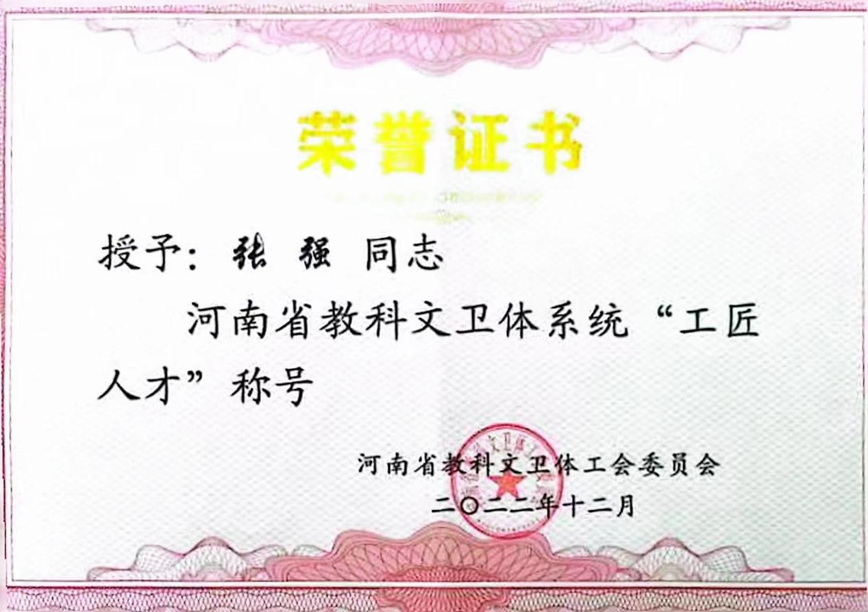 为大力弘扬劳模精神、工匠精神、劳动精神,河南省教科文卫体工会下发了《关于申报河南省教科文卫体系统示范性劳模和工匠人才创新工作室、选树河南省教科文卫体系统优秀工匠人才和“师带徒”标兵的通知》(豫教科文卫体工【2022】21号文件),体育学院教师张强在本次活动中被选树为河南省教科文卫体系统“工匠人才”称号。
