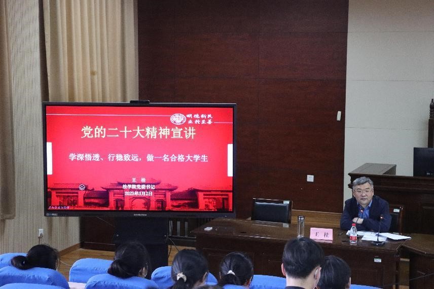 王桂以“学深悟透、行稳致远,做一名合格大学生”为题,围绕党的二十大精神的核心要义展开论述。他表示,党的二十大擘画了全面建成社会主义现代化强国、实现第二个百年奋斗目标的宏伟蓝图,具有很强的逻辑性和系统性,只有全面、系统、深入地学习,才能深刻领会。同学们要在新时代背景下保持与时俱进,在时代洪流中明晰自身定位,处理好个人与集体的关系,讲奉献、有作为,突破“小我”,实现“大我”。他表示,作为学生不仅要学好专业知识,提高政治理论修养,还要在实践中磨炼自己,提高自己的综合能力,努力成长为新时代经世致用的法治人才,把个人理想融入时代发展大局,实现自己的人生价值。