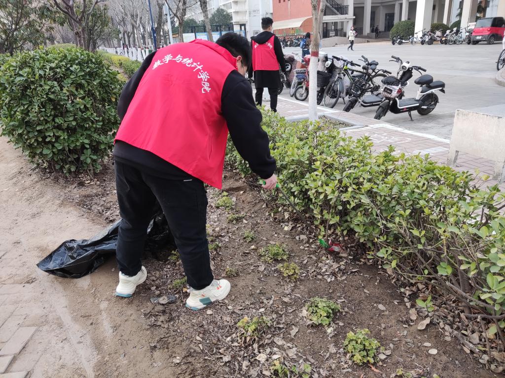 3月3日早上,在党支部书记吕晓瑞老师的带领下,党员、入党积极分子等组成的志愿者队伍于金明校区综合楼门口集合,分为四个小组在校园不同区域分别开展志愿活动。志愿者们身着红马甲,手持工具,干劲十足,他们将绿化带、道路上的塑料袋、废纸、垃圾等废弃物一一清除,使校园环境得到整洁、净化。时值上课早高峰,志愿者们把综合楼前随意摆放的单车摆放到指定的区域内,引导并协助后续的同学有序停放车辆,对乱停乱放车辆的同学进行规劝等,在大家的不懈努力下,综合楼前的车辆变得整齐有序。志愿者们用自己的双手为同学们营造了干净、祥和、文明的学习生活环境。