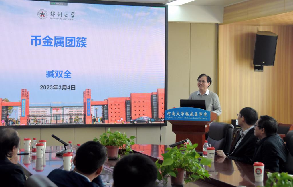以“增进学者友谊、促进学术创新、推进‘一流’建设”为旨归的河南大学“X+医学”学科交叉午茶会(X+Medicine Interdisciplinary Biweekly Seminar,HENU.简称“X+MIBS”)2023年第一期于3月4日在金明校区曾宪梓楼214学术报告厅举办。我校杰出校友、国家杰青、中原学者、郑州大学学术副校长臧双全教授应邀回母校作“币金属团簇修饰与组装及其生物医学应用”专题学术报告。基础医学院季少平特聘教授、材料学院副院长白锋教授、化学化工学院赵俊伟教授参加与谈。报告会由药学院副院长宋仕永教授主持。