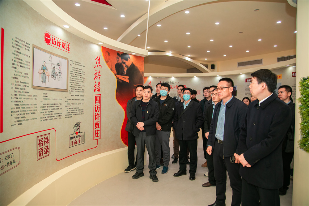 培训班成员首先来到兰考县桐乡街道许贡庄社区,路旁竖立着大型红旗雕塑,镌刻的“让党旗飘扬在群众最需要的地方”等标语时刻提醒广大干部群众牢记焦裕禄精神。走进社区党群服务中心,参观党建展馆,“基层党建红旗社区”“乡风文明红旗社区”“治理有效红旗社区”的匾额挂在醒目的位置。时间前移半个多世纪,当时的许贡庄生产队在盐碱灾害严重的困境下,坚决不要救济,靠自己的双手改变了家园面貌,被焦裕禄命名为“硬骨头生产队”。其中,许贡庄社区的“五小”群众工作法、“五必清”、“五必到”等支部联社区、党群共融合的做法使培训班成员深受启发,学院党委书记乔家君表示:“社区基层党组织的很多做法非常值得我们学习,面对支部的老师同学们,大家要从关乎群众集体利益的小事做起,党支部书记要自查是否清晰了解支部内的情况,能否做到及时有效解决支部内的困难,真正用实际行动践行‘一名党员 一面旗帜 一个支部 一座堡垒’。”