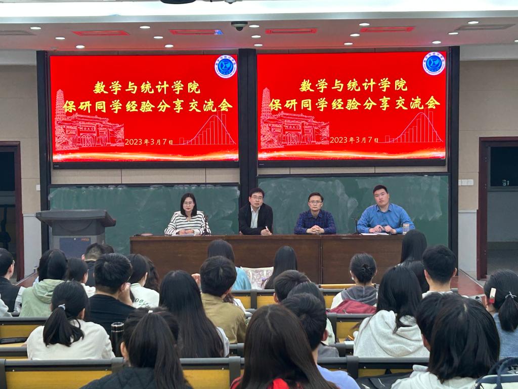 为更好地帮助2020级学生了解保研政策,学习保研经验,提前做好规划,数学与统计学院于3月7日晚在南阶教室举行了保研同学经验分享交流会。分享会邀请了学院党委副书记赵红磊,副院长解俊山,2019级本科生辅导员贾丽冰,行政办公室主任、2020级本科生辅导员安其丰及2019级30余名同学到现场为大家答疑解惑。2020级60余名同学参加了分享会,会议由安其丰主持。