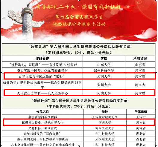 第六届全国高校大学生讲思政课公开课展示活动自2022年5月启动,历时10个月。活动中,马克思主义学院积极参与指导组织工作,组建指导教师团队,严格把关选题、多次组织磨课,指导每个团队挖掘出各自的特色和亮点。历经作品创作、校级选拔、打磨推选和国家评审四个阶段。马克思主义学院团队作品《百年大党与中国之治的“密码”》《人民江山万年长——以人民为中心》获得全国三等奖,《读懂河大校史,扬帆出彩人生》获全国优秀奖,三个获奖团队分别由马克思主义学院2019级本科生李文艳和2020级本科生温柳婷、包羽鸣担任负责人,学院副教授张枫林、郭强、沈贺分别担任指导教师。