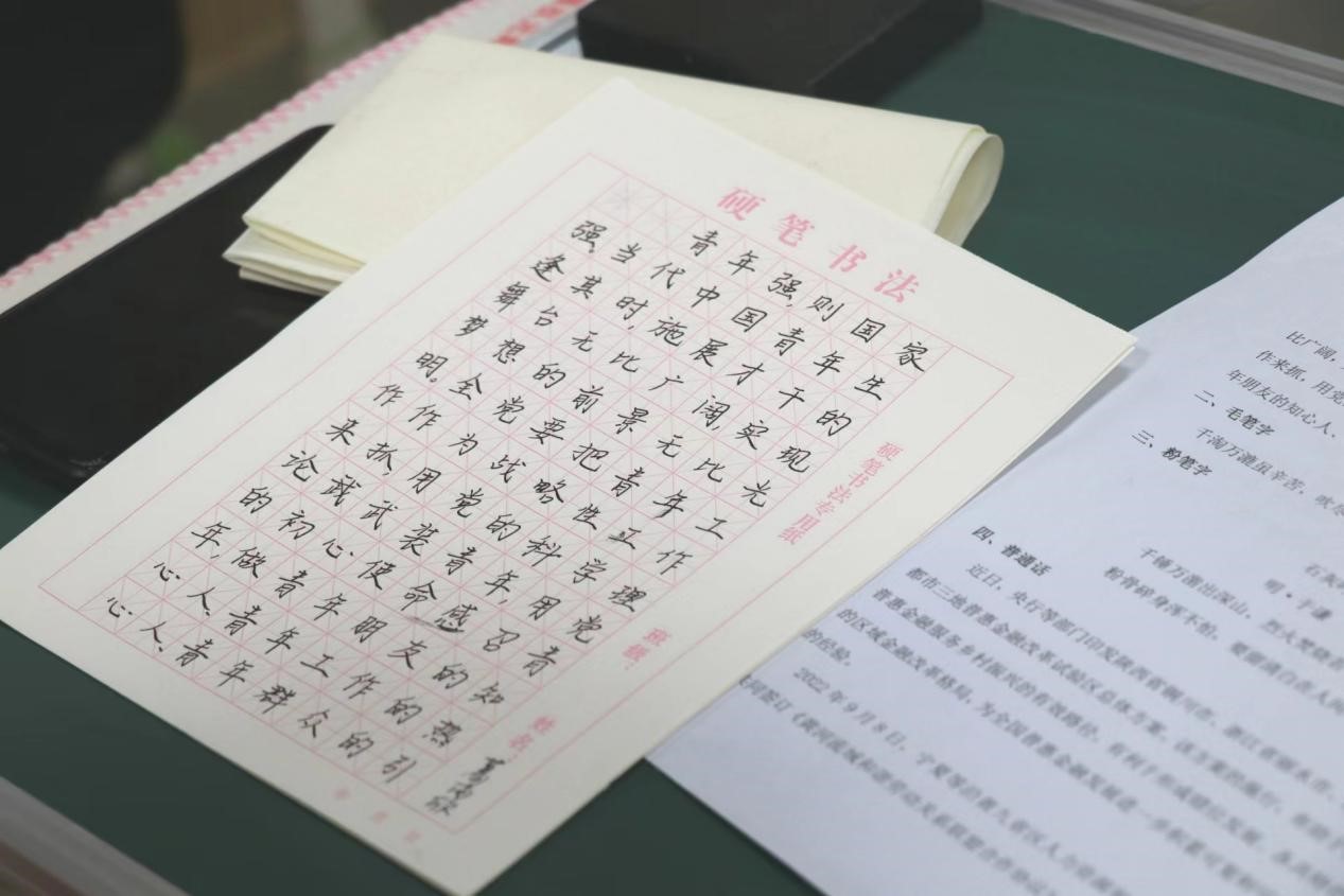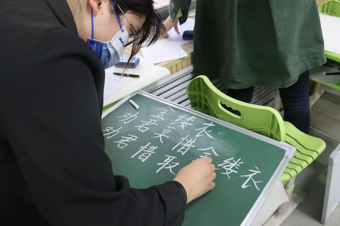 本次比赛分为钢笔书法、毛笔书法、粉笔书法以及普通话朗诵四个环节,从多方面考察学院师范学生的教学技能。参赛选手依据主办方分为两组分别进行三笔字和普通话比赛,评委老师现场根据选手表现进行专业打分,并在赛后计算综合成绩。在朗诵环节中,参赛学生们声音饱满有力、语气富含情感,姿态大方得体,表达自然流畅,表现出出色的教学技能和良好的师范风采,赢得了在场学生的热烈掌声;三笔环节中,参赛学生们全神贯注,手握钢笔、毛笔和粉笔伏案书写,一笔一划缓慢落下,展现了学院师范生的良好风貌。作品字迹端正,工整美观,显露出对古老汉字的敬重和对师范教学的谨慎。