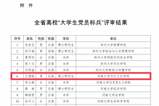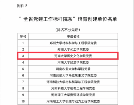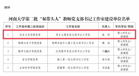 近日,全省高校党建工作强基引领“三级联创”系列活动评选结果及河南大学第二批“双带头人”教师党支部书记工作室建设名单相继发布,历史文化学院党委获批“全省党建工作标杆院系”培育创建单位,2020级硕士研究生王煜浩荣获河南省“大学生党员标兵”荣誉称号,考古文博系党支部书记张玲获批河南大学第二批“双带头人”教师党支部书记工作室建设名单,历史文化学院党建工作取得良好成效。