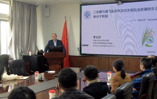 总第59期、2023年第5期河南大学“X+医学”学科交叉午茶会(X+Medicine Interdisciplinary Biweekly Seminar, HENU.简称“X+MIBS”)4月6日在药学院二楼报告厅举行,科技部“创新人才推进计划”、国家“万人计划”科技创新领军人才、河南大学“杰出人才特区支持计划”第二层次特聘教授李云河应邀作题为“二化螟与褐飞虱协同应对水稻抗虫防御的生化和分子机制——一个‘狼狈为奸’的昆虫故事”主题报告。作物逆境适应与改良国家重点实验室张长青教授、棉花生物学国家重点实验室蔡应繁教授、纳米材料工程研究中心田志红教授受邀作为与谈嘉宾,报告会由纳米材料工程研究中心邹雪艳教授主持。