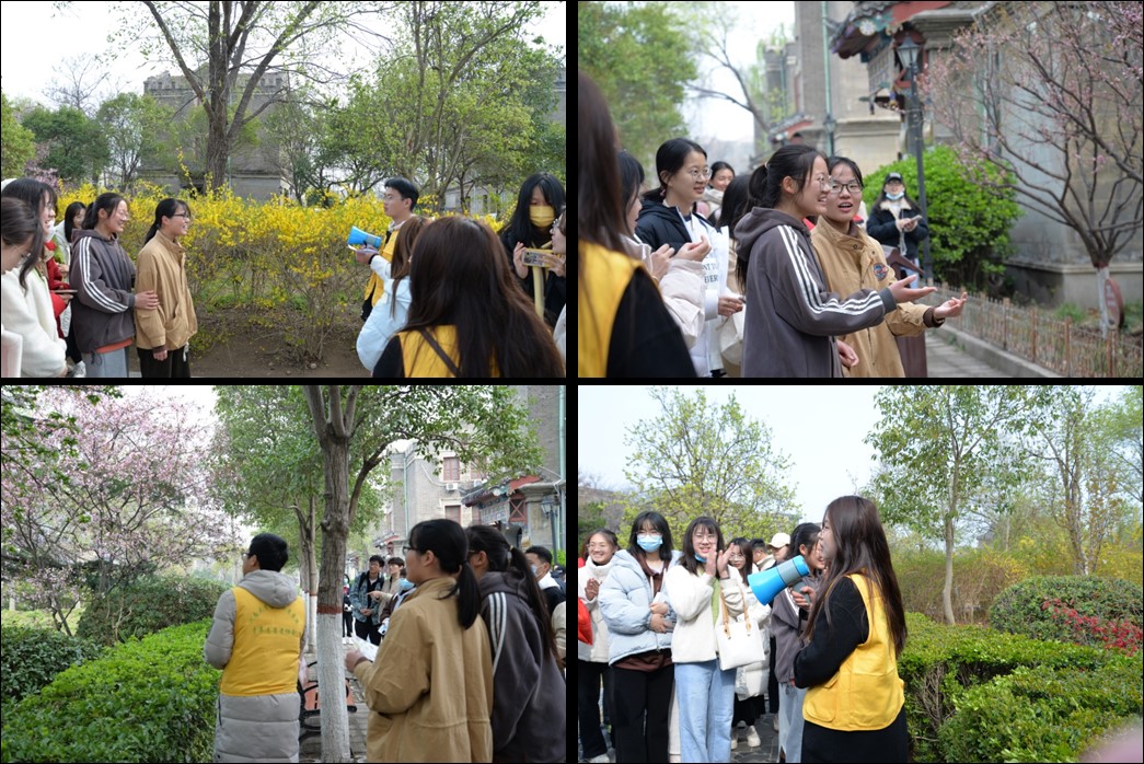 文化旅游学院的讲解员们则充分发挥对历史遗迹的熟知性,为生命科学学院的学生细致生动地讲解了明伦校区所承载的历史。他们从南大门出发,沿着南大门和大礼堂的中轴线博雅路依次介绍沿途建筑特色以及校史渊源,博雅路东侧的纪念碑、河南留学欧美预备学校大门、林伯襄先生铜像、小礼堂、文物馆、七号楼和东西斋房等都给同学们留下了深刻了印象,更加了解了学校的历史。