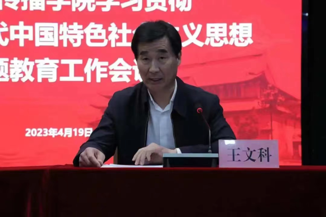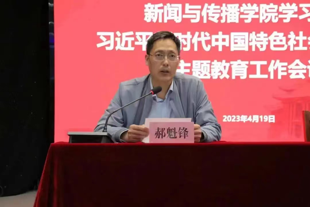 新闻与传播学院正处级组织员王文科传达习近平总书记在学习贯彻习近平新时代中国特色社会主义思想主题教育工作会议上的重要讲话精神。习近平总书记在会议上指出,以县处级以上领导干部为重点,在全党深入开展学习贯彻习近平新时代中国特色社会主义思想教育,是贯彻落实党的二十大精神的重要举措。