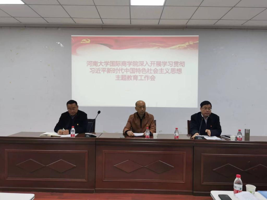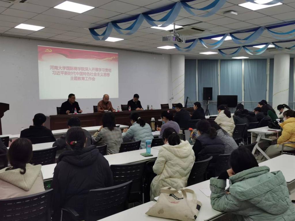 王创峰首先传达了河南大学学习贯彻习近平新时代中国特色社会主义思想主题教育工作会议精神和《河南大学深入开展学习贯彻习近平新时代中国特色社会主义思想主题教育实施方案》。他表示,学院党委将严格遵照学校主题教育的要求,全面贯彻落实党的二十大会议精神,深刻领悟“两个确立”的决定性意义,深刻领会此次主题教育的重大意义,组织开展好此次主题教育。通过此次主题教育,引导全体党员干部全面学习领会习近平新时代中国特色社会主义思想的科学体系、精髓要义、实践要求,促进全体党员干部全面学习、把握、落实党的二十大精神,推动学院各项事业高质量发展。学院党委将牢牢把握住这次主题教育“学思想、强党性、重实践、建新功”的总体要求,着力解决党员干部在理论学习、政治素质、能力本领、担当作为、工作作风、廉洁自律六个方面的问题;立足于中外合作办学,认真贯彻落实学校“双一流”建设要求,在对外交流合作、人才培养、师资队伍建设等方面深入开展调查研究;结合学院2023年重点任务,牢固树立以师生为中心的发展理念,不断转变工作作风、主动担当作为,增强服务本领、提升服务水平,扎扎实实办好民生实事,促进学院事业高质量发展。