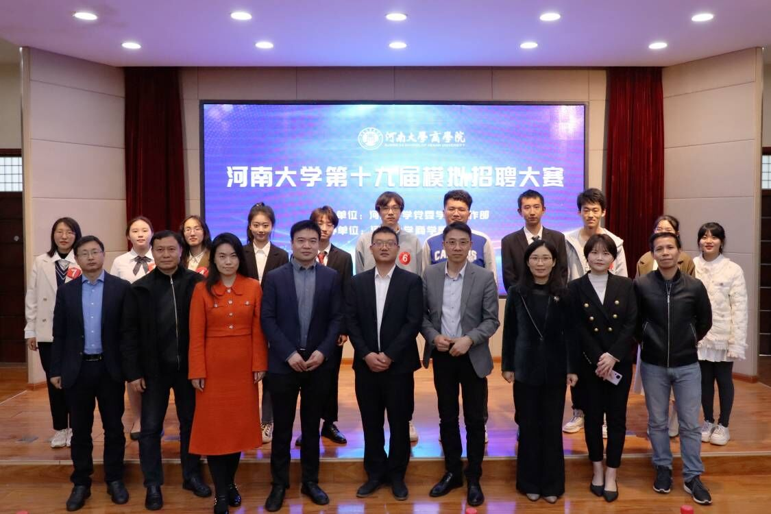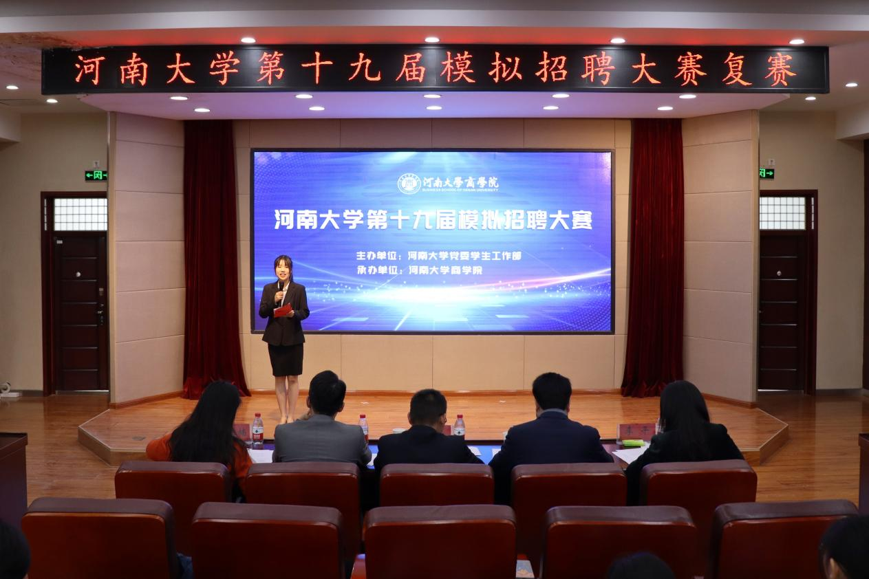 4月22日上午,由河南大学党委学生工作部主办、商学院承办的河南大学第十九届模拟招聘大赛复赛在商学院二阶报告厅举行。好想你健康食品股份有限公司人力资源总监张海滨,河南森源城市环境科技服务有限公司人力资源部总经理、许昌森源智慧环卫服务有限公司总经理杨磊,河南楷林教育科技公司总经理、上海楷邻科技有限公司总经理陈全力,山西证券河南分公司总经理郭楠楠,河南大学商学院党委副书记李平,人力资源管理系主任谢周亮,人力资源管理系老师邓传军出席本次比赛并担任评委。