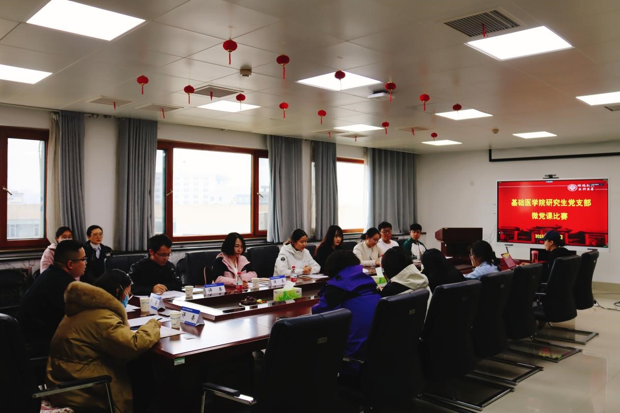 为引领广大研究生深入贯彻党的二十大精神,学习习近平总书记系列重要讲话精神,赓续精神血脉,续写时代华章,4月22日,基础医学院研究生党支部在学院五楼会议室举行了“赓续精神血脉·再续百年华章”主题微党课比赛,比赛以线上线下结合的方式开展。学院党办主任司伟荣、团委副书记吕双瑜、研究生党支部书记滕铁山和支部委员刘静担任比赛评委。经过前期准备和认真审核,共有12位同学的作品确定参加本次比赛,比赛由滕铁山主持。