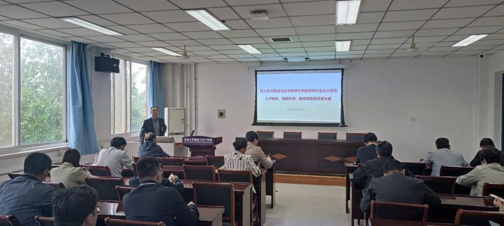 学院副院长邓浩作《深入学习贯彻习近平新时代中国特色社会主义思想——人才驱动、创新引领,推动学院高质量发展》主题报告。他表示,党的二十大报告对“实施科教兴国战略,强化现代化建设人才支撑”作了专门部署,深刻体现了习近平总书记对强国崛起规律、对当今新技术革命和产业变革的时代特征、对未来世界发展大势的深刻洞察和把握。随后,他结合学校的人才政策,就学院人才引育、科研工作规划思路、发展目标进行了详细介绍。他要求学院师生发扬“自信、拼搏、开放、创新”的新时代河大精神,踔厉奋发,奋楫争先,加强科技攻关,不断开创“双一流”建设新局面,努力在中原大地起高峰。
