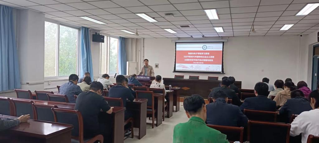 根据学校主题教育工作要求,按照学院主题教育工作安排,5月4日至5日,物理与电子学院学习贯彻习近平新时代中国特色社会主义思想主题教育读书班第一期集中学习会分别在学院A313会议室、锥形报告厅举行,会议通过自学研读、集中领学、专家辅导、分组讨论等形式进行,学院党政领导班子成员、各教工党支部支委和各系室(中心)主任参加读书班第一期集中学习会。