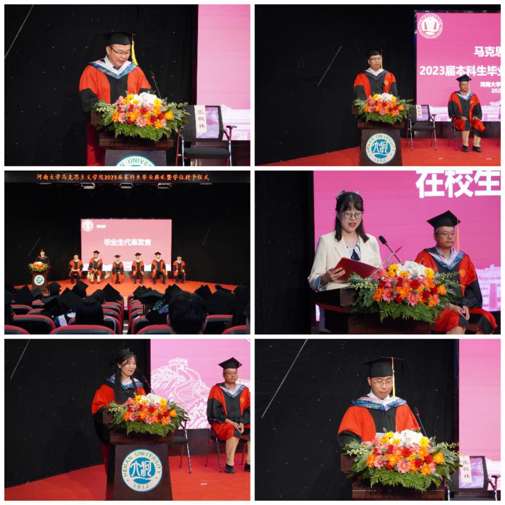 毕业生代表李文艳发言,代表全体毕业生对河南大学、马克思主义学院、各位老师、同学表达感谢。她表示“山水有相逢,来日皆可期”,鼓励毕业生们各自飞越远山、奔赴山海,在人民最需要的岗位上,贡献青春力量。