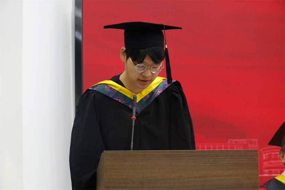 南晗代表学院向2023届全体毕业生表示最热烈的祝贺和最美好的祝愿!向为学生成长成才付出辛勤汗水的各位老师表示崇高的敬意!向守候在家乡的同学们的父母表示亲切的问候!毕业是对大学生涯的总结,毕业是职业人生的开始。他希望同学们勤于学习,养成终身学习的习惯,做到学以致用。在面对人生逆境和挫折时,能够保持乐观的心态,直面应对。作为新时代的青年大学生,要扛起时代赋予大家的历史责任,在全面实现中华民族伟大复兴的新征程中奉献青春韶华。四年师友昨日成追忆,千里之行今朝正起航。请大家谨记“明德新民,止于至善”的校训,践行“百折不挠、自强不息”的大学精神,乘风破浪会有时,直挂云帆济沧海。