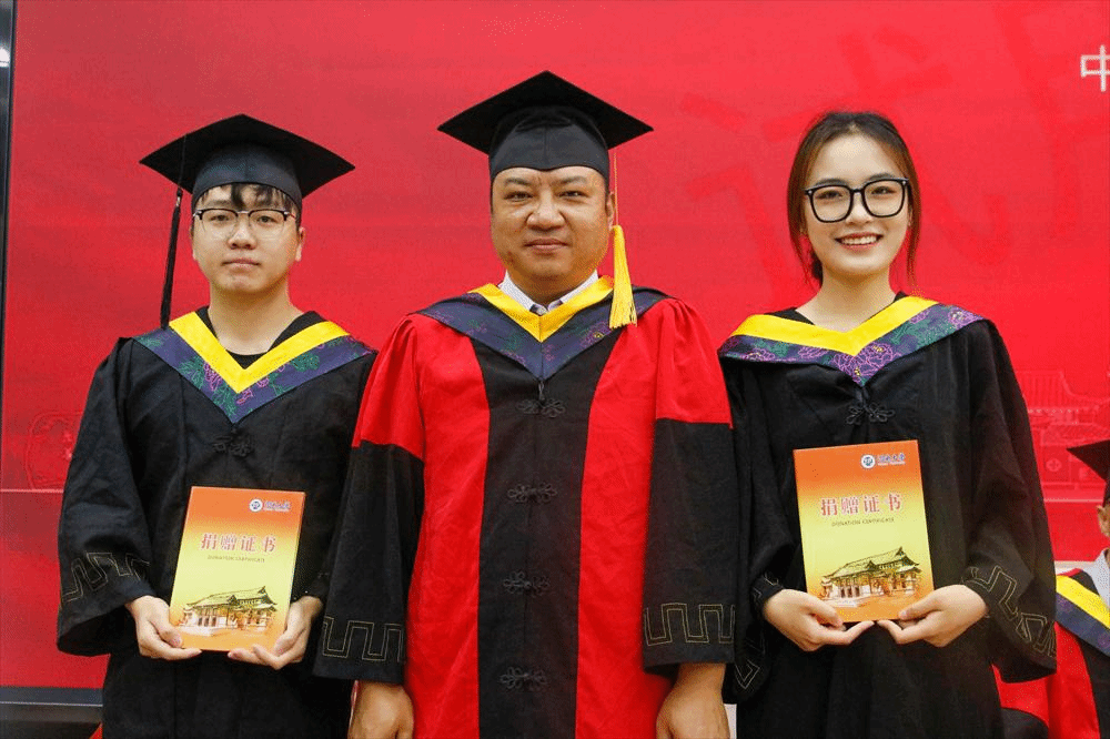 在典礼开始之前,受河南大学教育发展基金会的委托,李锋向积极参与“饮流怀源·微爱传递——毕业季一元捐”活动的2018级本科生代表张苏、2019级本科生代表罗雪龙颁发捐赠证书。