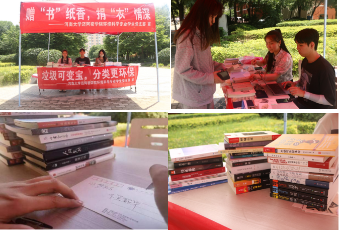 本次活动在金明校区南苑广场开展,包括“垃圾可变宝,分类更环保”环保常识公益宣讲和“赠‘书’纸香,捐‘衣’情深”以物换物爱心捐赠活动。炎炎夏日,现场气氛热烈,吸引了许多师生参与。支部成员通过新媒体推送、宣传展板、设立环保咨询台等线上线下相结合的方式,向过往师生宣传垃圾分类常识、校园垃圾处理办法等环保知识,引导大家增强节约意识、环保意识、生态意识,从自身做起,从一点一滴做起,共同守护天蓝地绿水净的美好家园。在“赠‘书’纸香,捐‘衣’情深”活动部分,老师和同学们纷纷将闲置的课外读物、干净衣物捐赠到活动现场,换取河南大学纪念品的同时,留下自己的环保宣言。