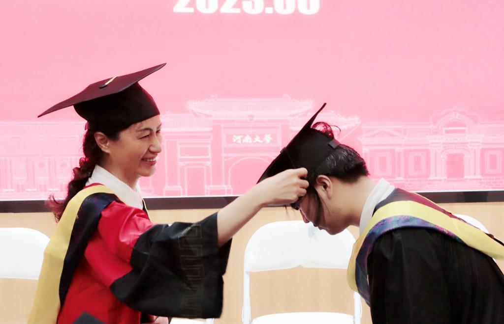在雄壮的国歌声中,毕业典礼缓缓拉开了序幕。副院长秦春斌宣读了《河南大学2023届本科毕业生学士学位授予决定》。随后,院长路杨为毕业学子们一一援正流苏,颁发学士学位证书并祝贺毕业生顺利获得学士学位。