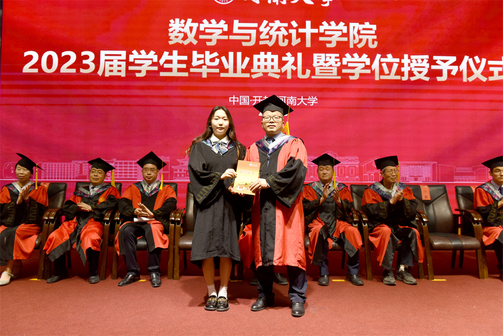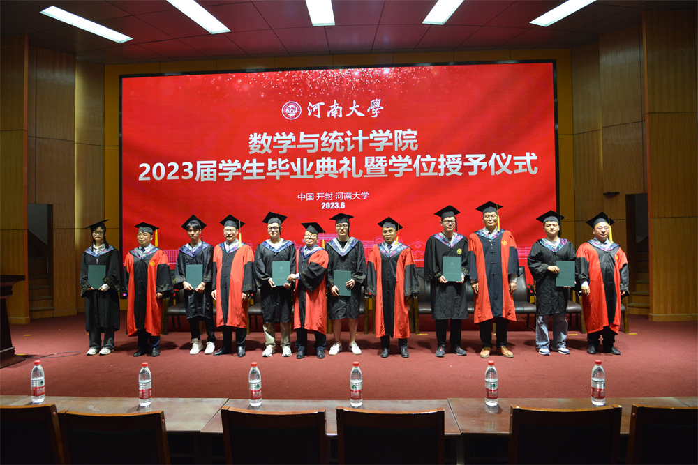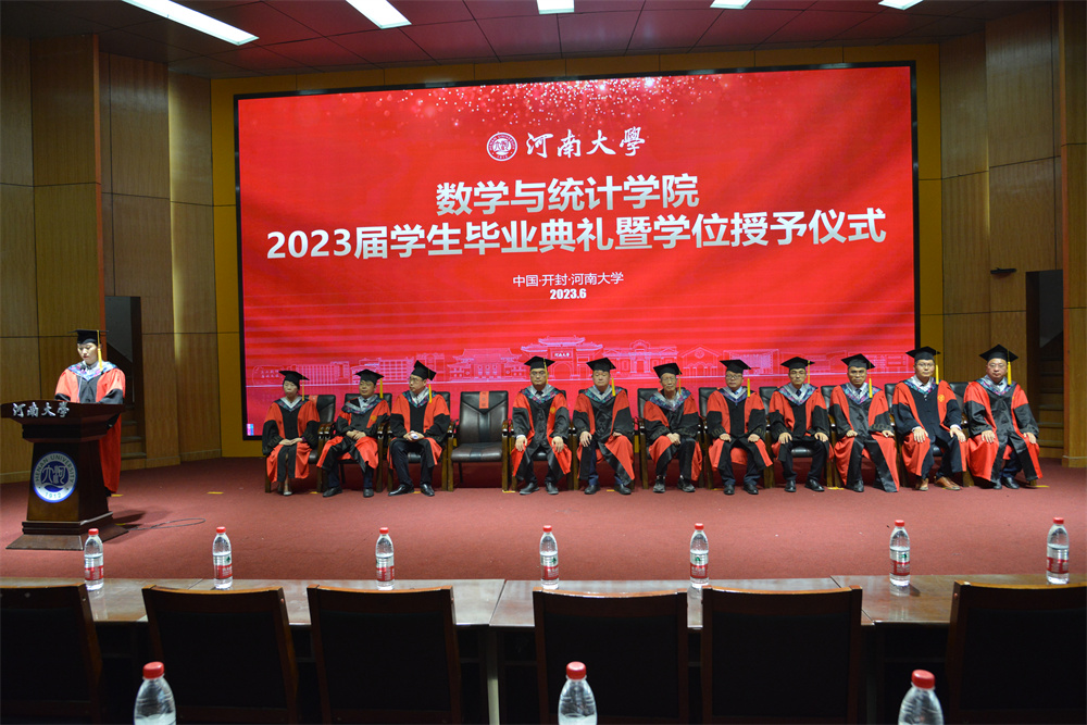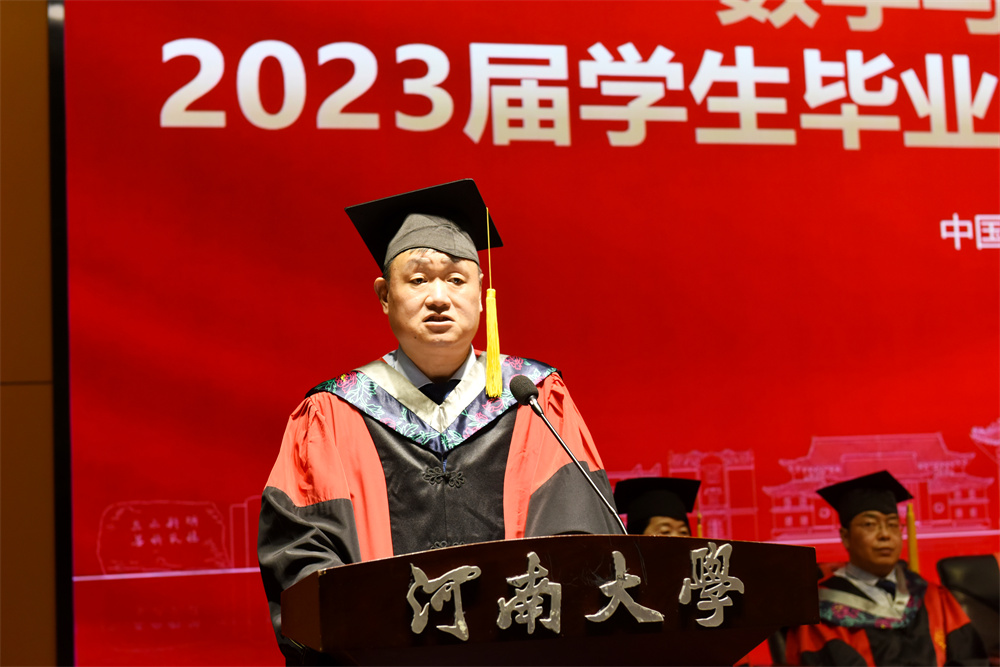 六月份,是莘莘学子收获的季节,也是大家离别的时刻。6月7日上午,数学与统计学院2023届本科生毕业典礼暨学位授予仪式在计算机二楼报告厅举行。河南大学副校长张立新,河南大学数学与统计学院原院长、首都师范大学吴可,河南大学数学与统计学院党委书记曹志伟,院长、学位委员会主席韩小森,学院党委副书记刘佳明,副院长杨一平,副院长、学位委员会副主席解俊山,副院长、学位委员会成员唐恒才,学位委员会成员葛志昊、王沛、楚彦军参加典礼,学院领导班子成员、教师代表、各年级辅导员及2023届全体毕业生参加了典礼。典礼由刘佳明主持。