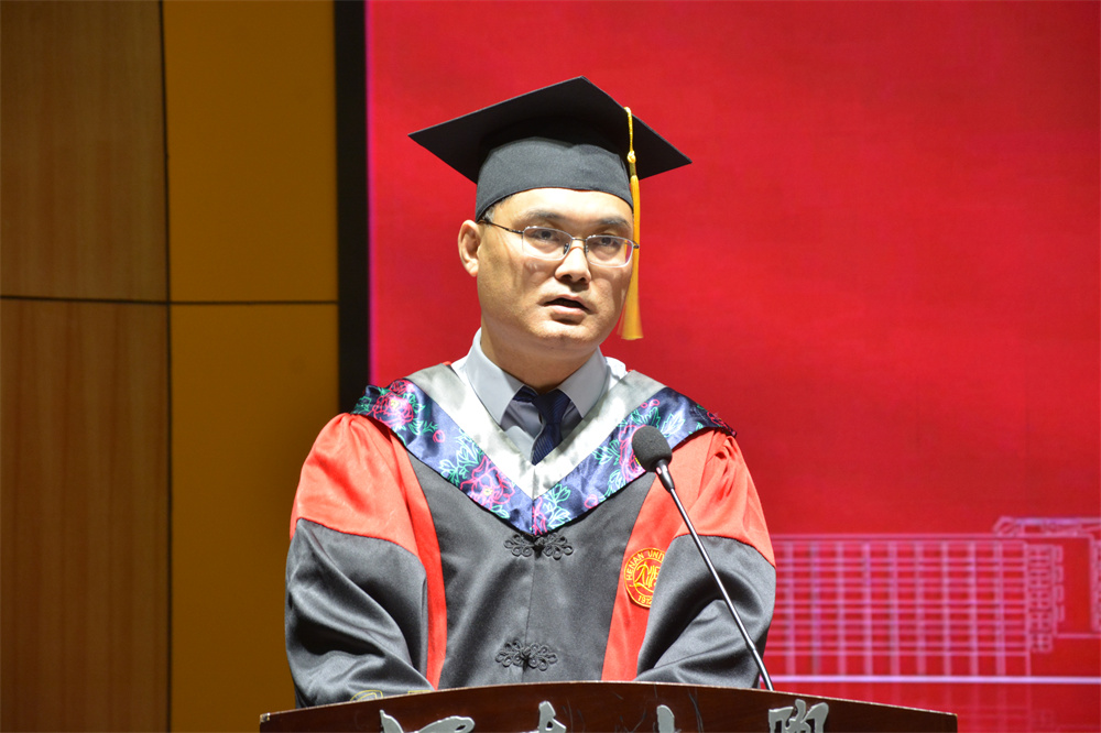 曹志伟代表全院师生,向圆满完成学业的同学们表示热烈的祝贺。他希望同学们珍藏这四年时光,记住奋斗的青春,记着身边勤奋的身影,让这段经历成为激励今后攀登科学高峰、开创美好人生的宝贵财富;传承河大精神,保持自强不息的精神底色,砥砺家国情怀,筑牢理想信念;坚守心中梦想,无论身处何处,都不要忘记初心和使命;勇于担当,做甘于奉献志存高远、脚踏实地的时代弄潮儿。