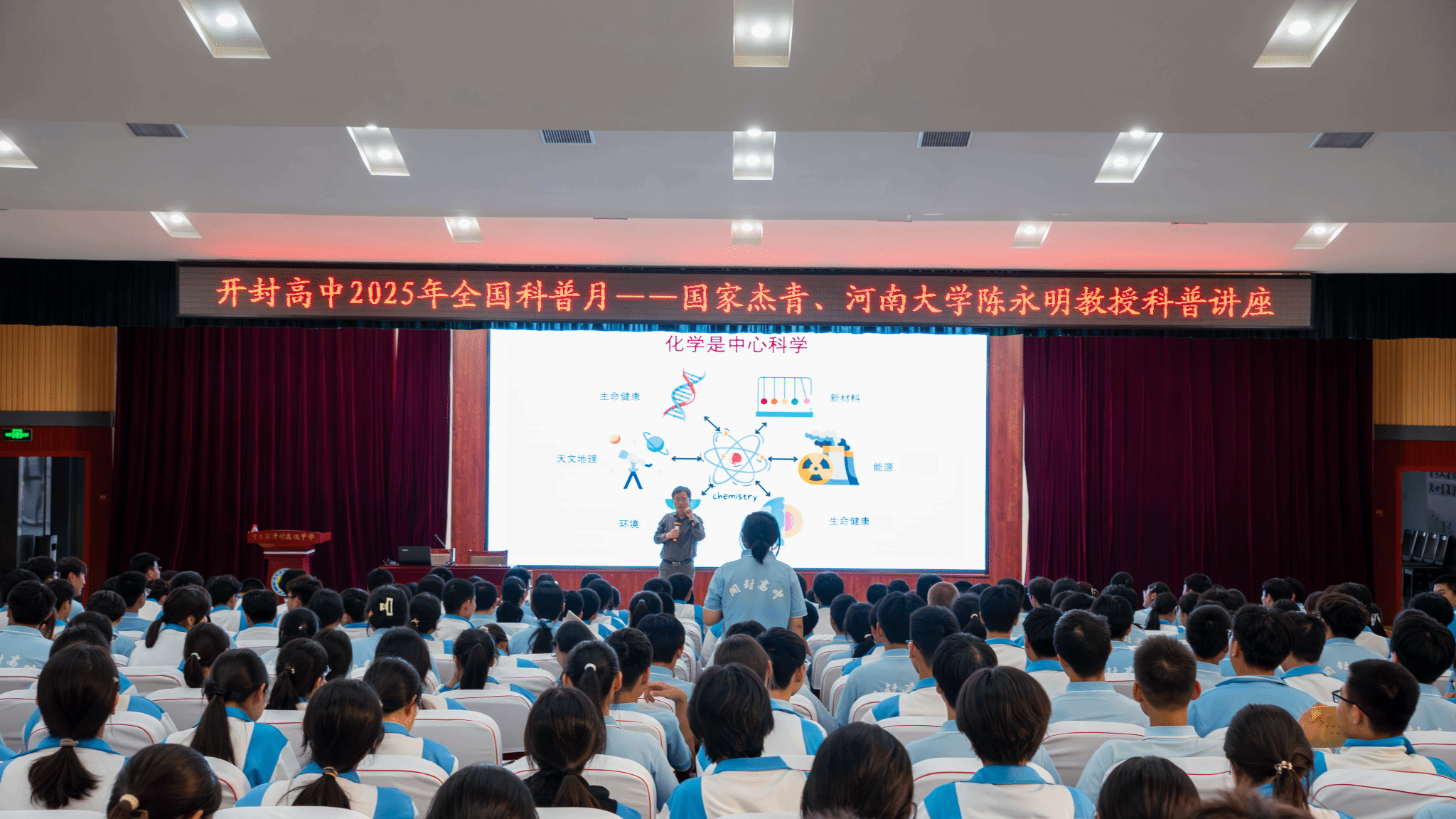 今年九月为全国首个科普月,为更好提升全民科学素质,营造浓厚的科学氛围,助力科技强国建设,同时积极探索高等教育与基础教育有效衔接的新模式,共同提升化学人才培养质量,9月25日下午,国家杰青、化学与分子科学学院院长陈永明,化学系负责人冯彩霞、教务办公室主任王玉霞和院团委副书记田梦一行赴开封高级中学开展科普讲座和学生培养交流座谈活动。开封高级中学副校长尚嘉伟、化学组教研组长赵辉和教研组老师以及400余名学生参与了活动,开封高中教务处副主任刘冉主持座谈会及讲座。