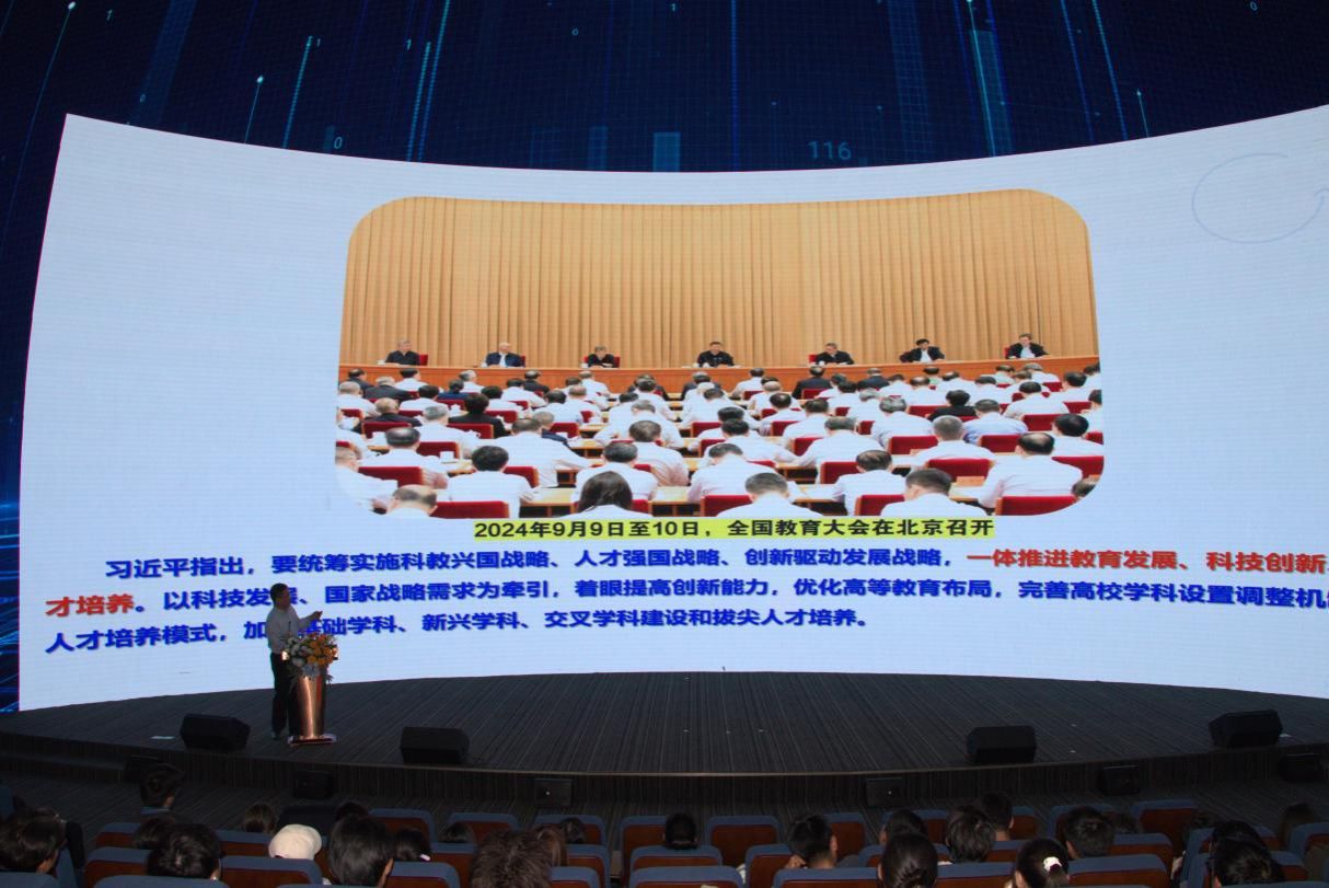 尹猛接下来为新生讲授 “开学第一课”。他结合教育科技人才一体化发展战略与 “人工智能+”背景,介绍学院 “1355”发展模式及人才培养目标,详解“内圣外王”修身路径与五育并举成长要求,勉励新生立报国志、融个人发展于时代,勇担民族复兴重任。