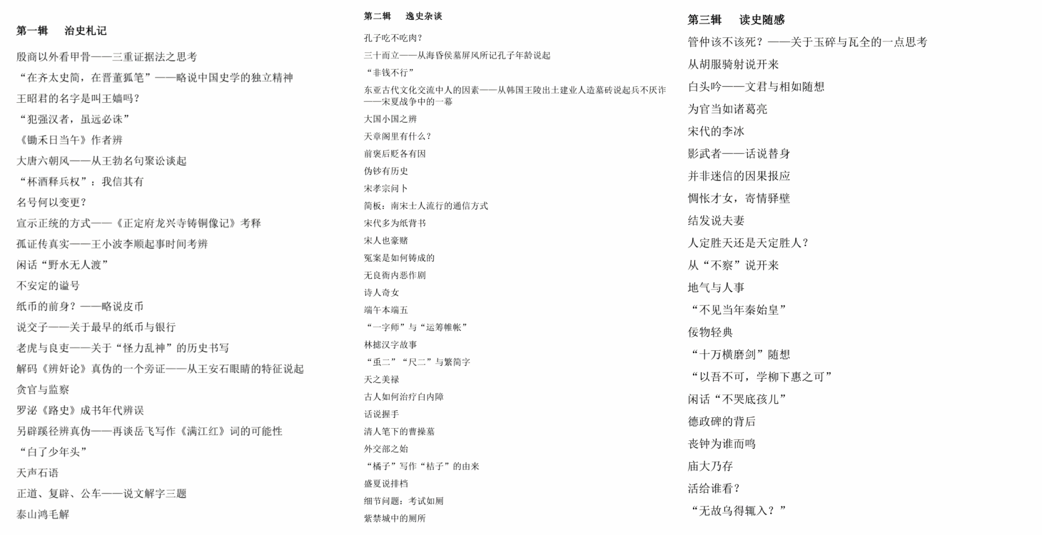 本书既有对“杯酒释兵权”“犯强汉者,虽远必诛”等重大典故的深度剖析,也关注“古人如何治疗白内障”“纸币的前身”“端午本作端五”等生动细节。作者以举重若轻的笔触,探微索隐,将古代伪钞、宋孝宗问卜、王昭君名字等历史谜题娓娓道来。全书视野宏阔,内容跨越殷商甲骨至清代笔记,贯穿赵武灵王胡服骑射至宋代“排档”百态,兼顾政治、经济、文化等多维面向。书中既有对中国史学精神的宏大思考,也不乏“孔子是否吃肉”“古人考试如厕”等生活细节,展现出历史的全景图像。正如作者所言:“不拘泥于某个特定领域,不仅仅仰视高山俯瞰大河,也以广角的视野把小草浪花收入眼底。这就是本书收录历年所写短文的宗旨。有阐幽发微,有史事议论。出入于文史之间,兼顾考证与义理。它们虽非鸿篇巨制,然亦偶有一得之见,自成一家之言。”